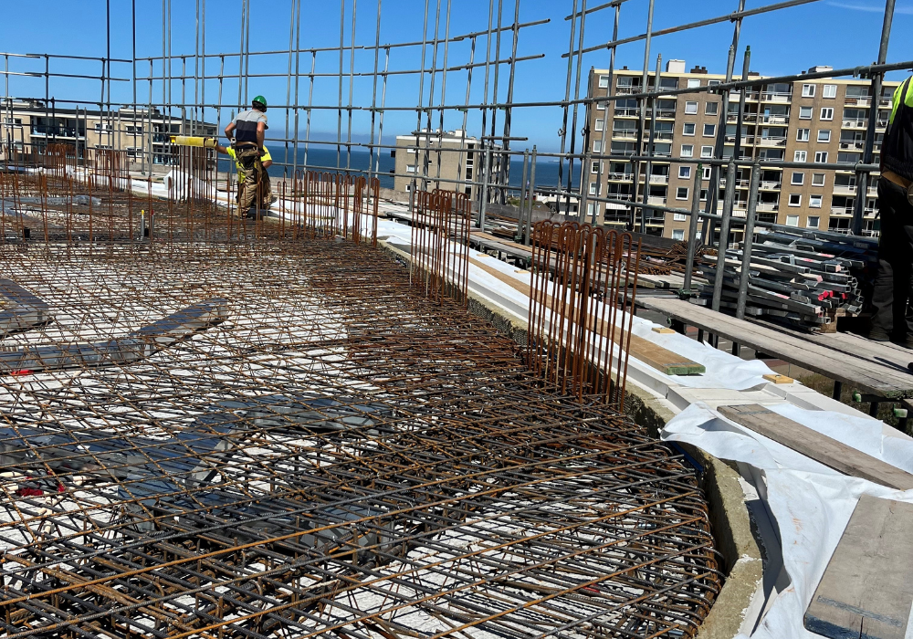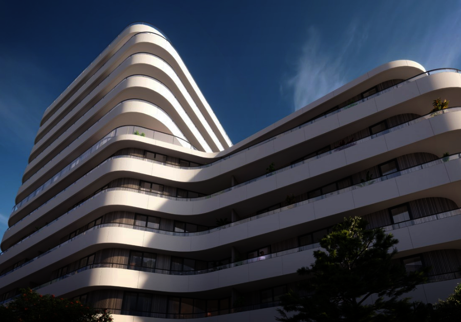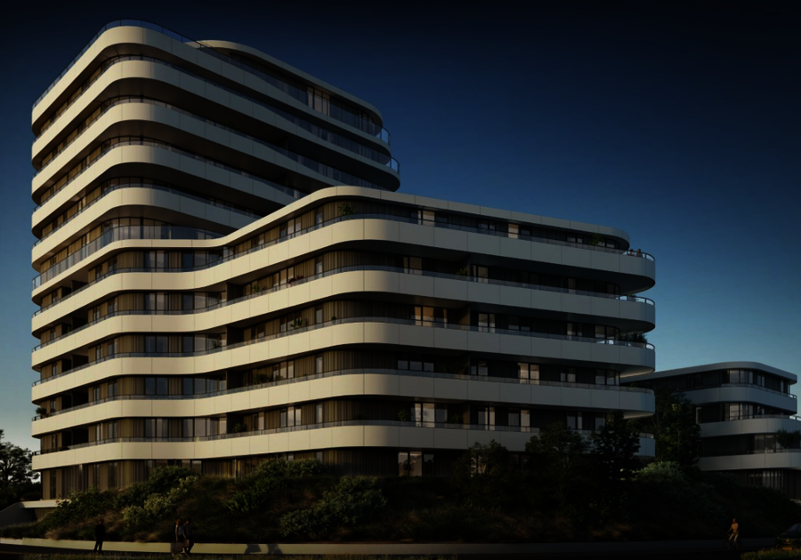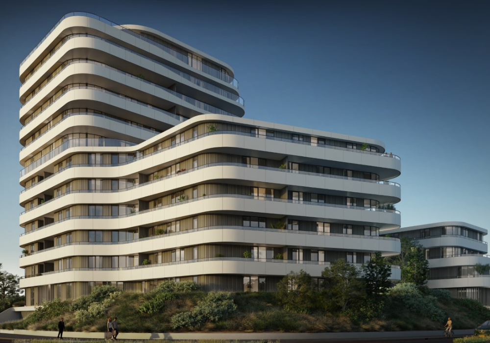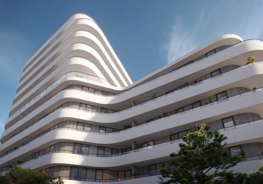 Geelen Beton levert voor dit project: witte balkon en galerijplaten in gebogen vormen, vlakke liftwanden en trapwanden, ronde kolommen, trappen en bordessen.