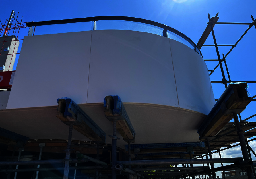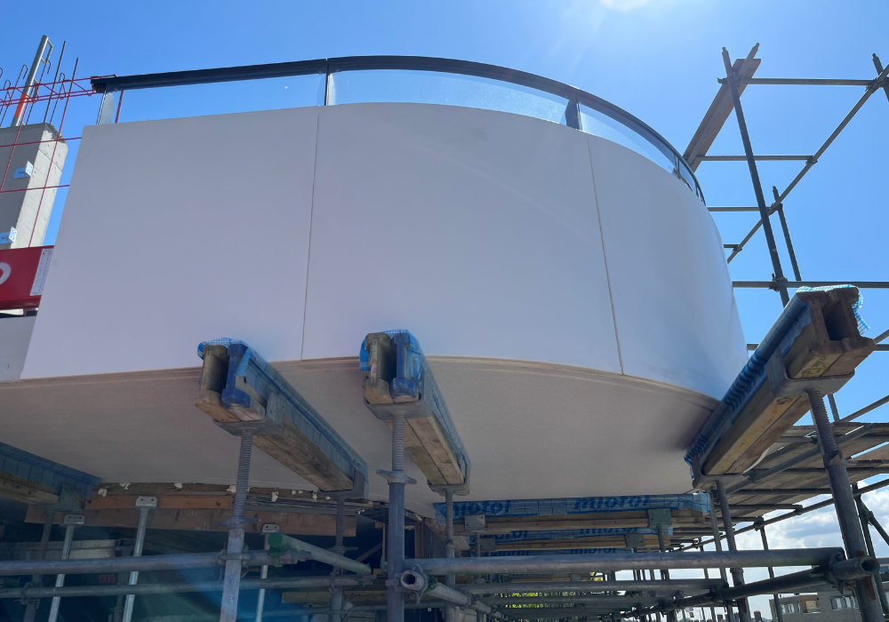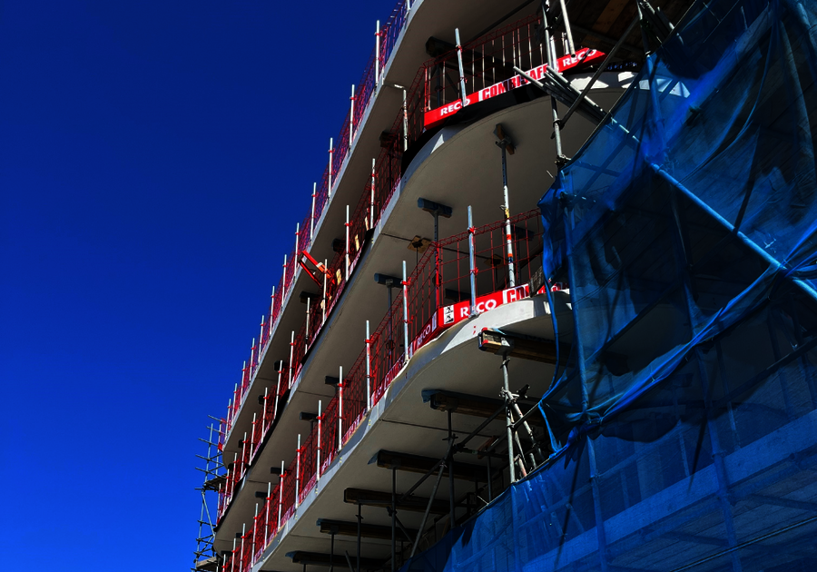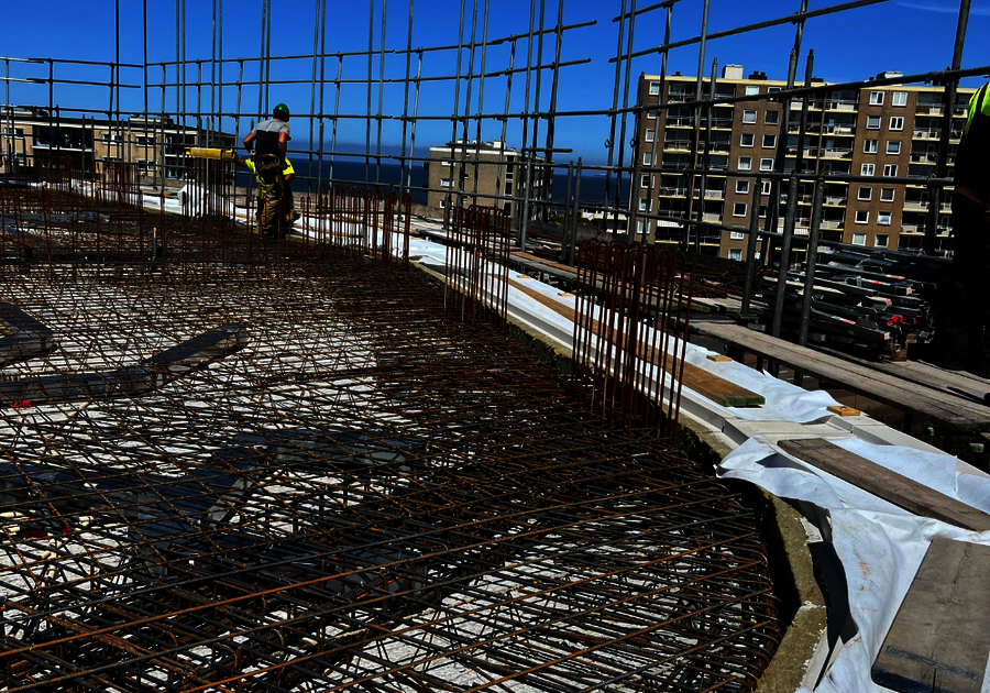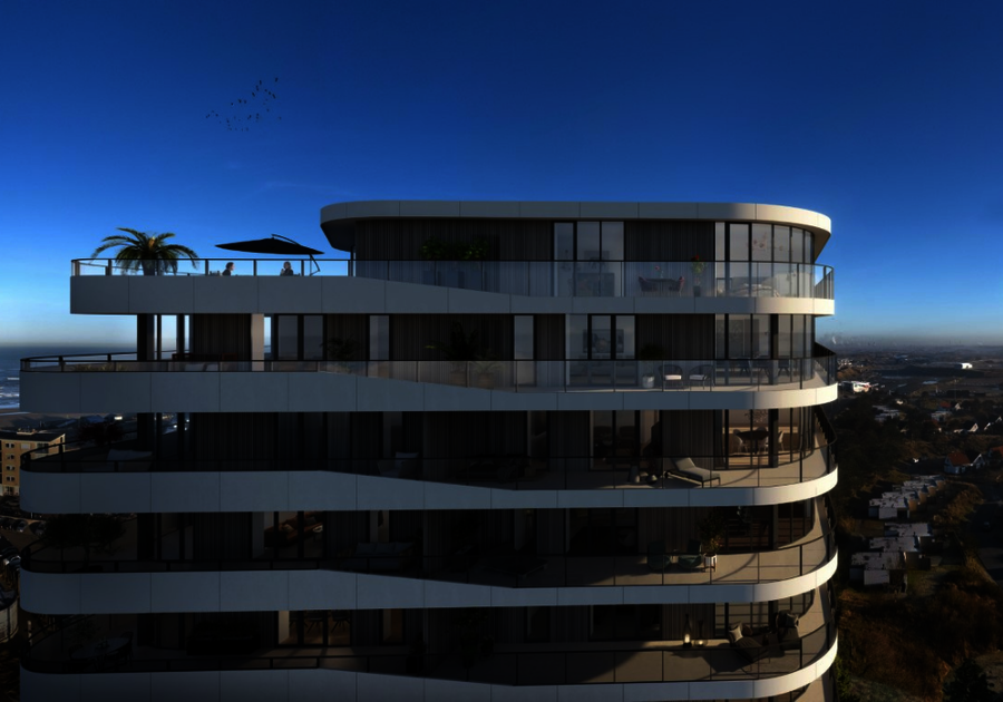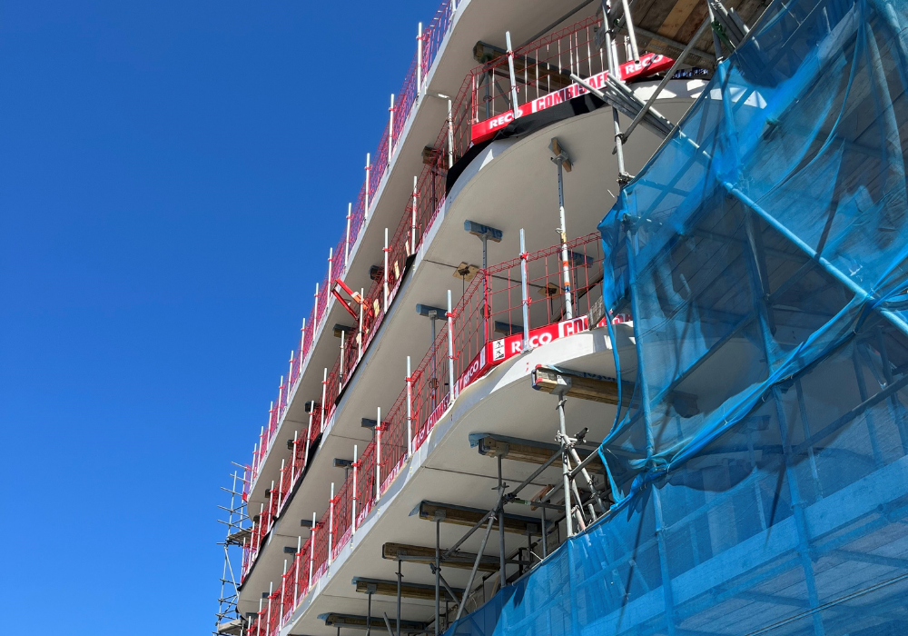 Geelen Beton levert voor dit project: witte balkon en galerijplaten in gebogen vormen, vlakke liftwanden en trapwanden, ronde kolommen, trappen en bordessen.